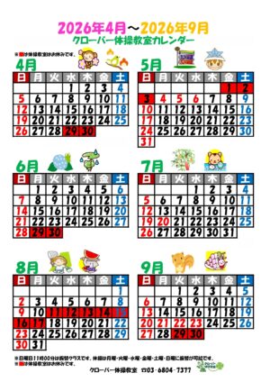 2026年4月から9月までのクローバー体操教室カレンダーを更新いたしました!
