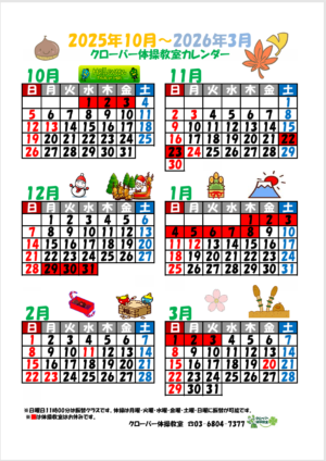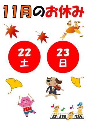 教室のメンテナンスの関係で、11月のお休みが変更になりましたのでお知らせ致します。